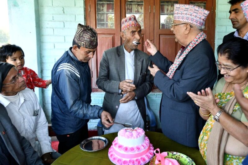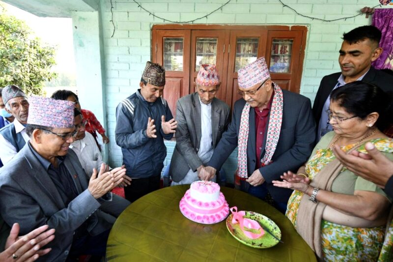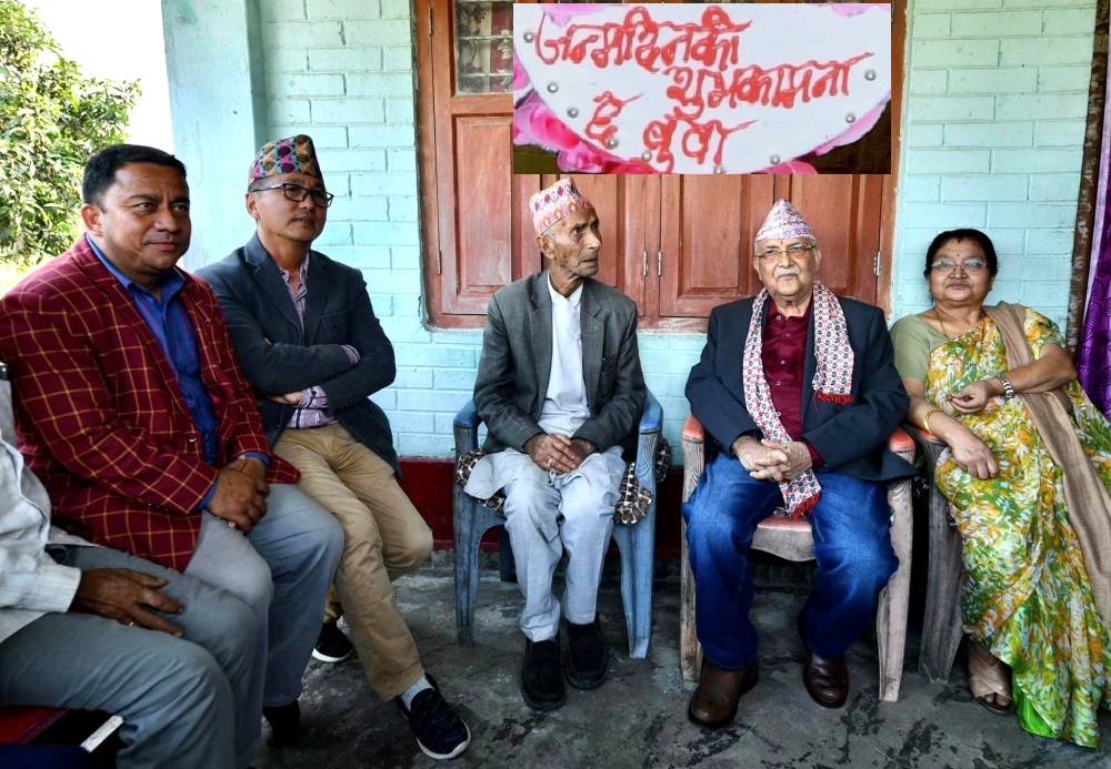 पूर्वप्रधानमन्त्रीसमेत रहेका अध्यक्ष ओलीले झापा पृथ्वीनगरस्थित निवासमा पुगेर बुबाको जन्मदिनको शुभकामना व्यक्त गरे ।